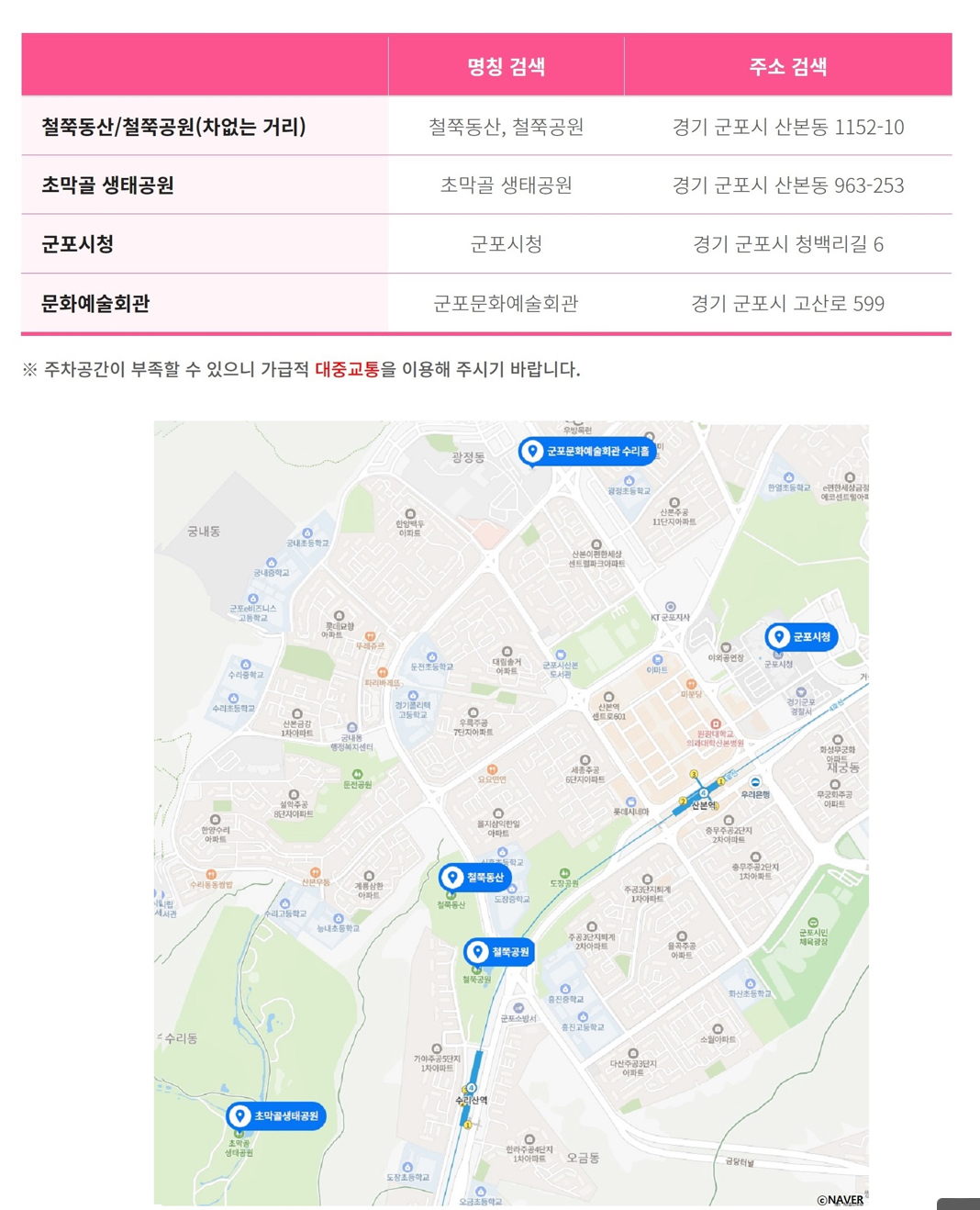 축제 기간에는 군포시 전역이 붐비는 만큼, 사전 교통 정보를 숙지하고 움직이는 것이 좋습니다.